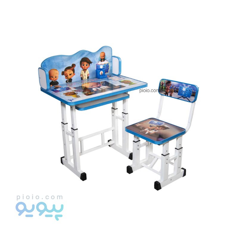 میز تحریر دانش آموز طرح بچه رئیس : این میز تحریر طرح یکی از شخصیت های محبوب بین بچه ها می باشد که هم دختر بچه ها وهم پسر بچه هابه آن علاقه دارند.برای بچه هایی که تازه مدرسه می روند خرید میز تحریر کمک می کند که به درس خواندن مشتاق شوند و با طرز صحیح پشت میز نشستن از مطالعه خسته نشوند.پایه های میز از جنس فلزی بسیار مقاوم است که قابلیت تنظیم ارتفاع تا 15 سانتی متر را نیز دارد.رنگ پایه ها الکترواستاتیک ضد خش است. بر روی صفحه چوبی نئوپان ملامینه محفظه ای برای قرار دادن کتاب ها، دفتر و لیوان وجود دارد.این میز تحریر که حدودا 16 کیلو وزن دارد، برای رده سنی زیر دوازده سال مناسب است.این میز تحریر ابعاد مناسبی دارد که فضای زیادی اشغال نمی کند و به راحتی در گوشه ی خانه جای میگیرد.